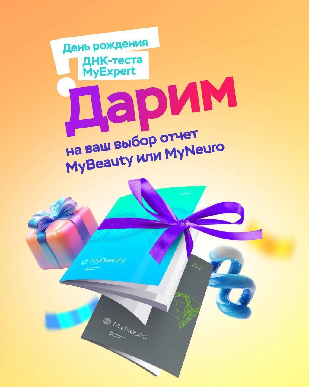 🎁 Только сейчас у вас есть уникальная возможность сделать 2 ДНК-теста по цене одного. До 27 августа при покупке ДНК-теста MyExpert, вы получите электронную версию отчета MyNeuro или MyBeauty в подарок.